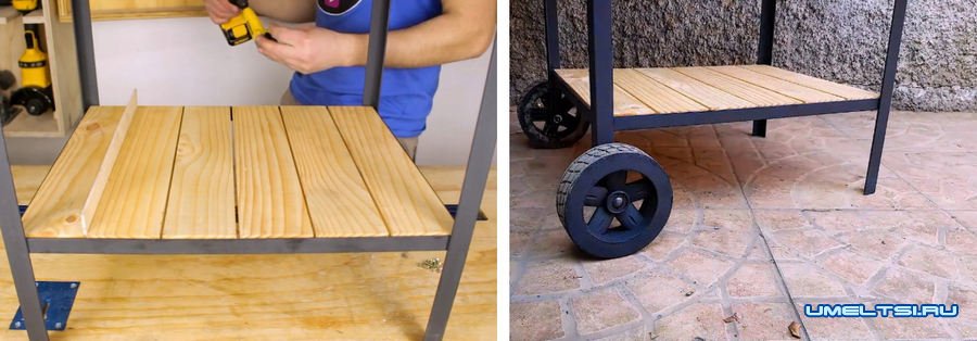 Рукоятки для ручек решетки и крышки выполнил из деревянного бруса. Из доски 20-мм вырезал детали для боковых и нижней полочек. Пропитал их маслом тикового дерева перед установкой. Для установки колес немного укоротил две ножки и просверлил в них отверстия.