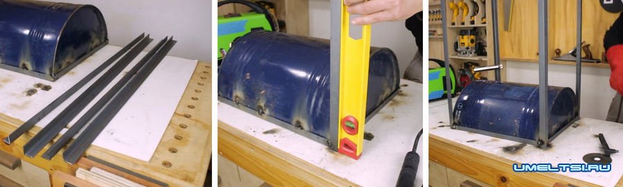 Из стального уголка 20x20 мм нарезал элементы рамки. Торцы срезал под углом 45 град. Разложил заготовки на ровную поверхность и зафиксировал в углах сваркой. Удалил шлак и зачистил поверхность металлической щеткой. Половину бочки установил краями внутрь рамы, приварил ее и прошел сваркой по внешним углам рамы (фото 2).