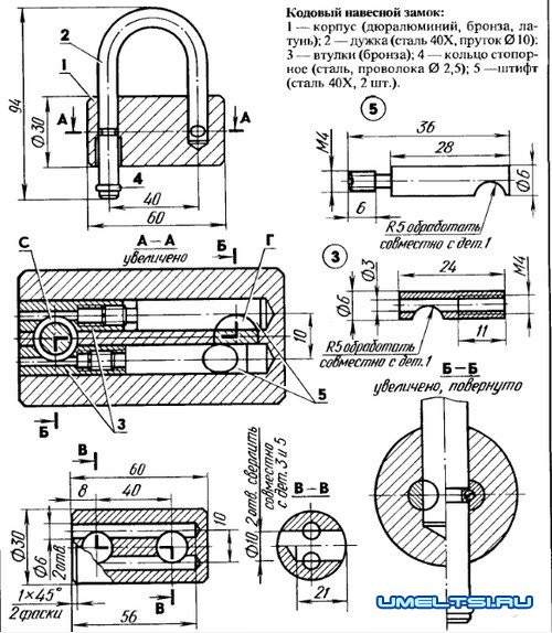Предлагаемый замок, как уже отмечалось, не только особо прочный, -но и тонкий механизм. Однако, поскольку мы ориентируемся не на заводское его изготовление, опустим на чертежах допуски и посадки: требуемая точность может быть достигнута за счет совместной обработки и подгонки деталей, вполне доступных для самой скромной мастерской домашнего мастера.