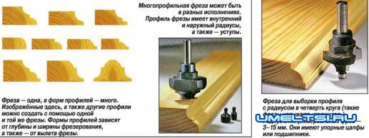 Для формирования сложных профилей можно использовать последовательно несколько различных фрез по дереву для ручного фрезера этого типа или только так называемую многопрофильную фрезу.