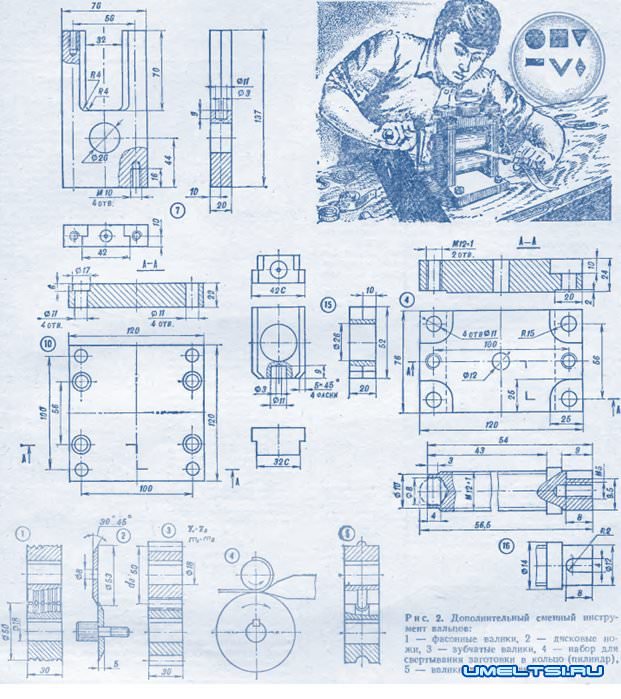 Сборка вальцов заключается в соединении элементов остова и параллельной установке валиков. Для выполнения дополнительных операций разбирать станочек не потребуется: инструменты быстро крепятся консольно на хвостовиках осей валиков. Для этого в них предусмотрены осевые отверстия с резьбой MB, а снаружи — шпонки для передачи вращения. Там же крепятся на резьбовых оправках и дисковые ножи. Если требуется отрезать полоску шириной более 35 мм, используют удлиненную оправку, которая отдалит ножи от стойки на большее расстояние.