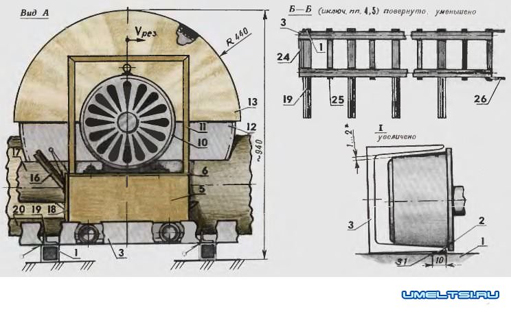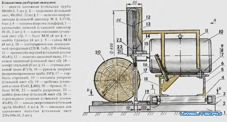 Остальное, думается, ясно из рисунка, за исключением разве что «секретов» работы на такой пилораме. А они сводятся к тому, что бревно при помощи подставных кругляшей или отрезков труб я закатываю на швеллерные направляющие, а затем сбрасываю на гребенку, где оно фиксируется в нужном положении относительно дисковой пилы под действием своего веса и дополнительного удара кувалды.