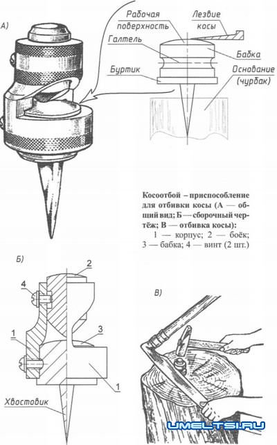 Качественная отбивка косы - это если не искусство, то уж, во всяком случае - высокое ремесло, которым обладает далеко не каждый. Поэтому для неопытных, умельцы придумали приспособление, названное ими косоотбоем. Оно уже не требует значительных навыков и обеспечивает достаточное качество подготовки косы к работе.