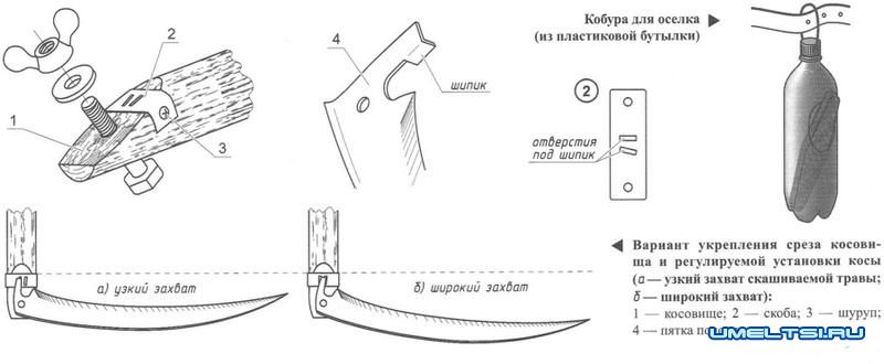 Совет тем, кто впервые берёт в руки ручную косу. Самое нагруженное место косы - соединение полотна и косовища, а самое слабое звено здесь - нижний конец (срез) косовища. При ослаблении кольцевого крепления (что не сразу замечает даже опытный косарь) неминуемо «разбивается» шипиковое гнездо на срезе и при этом может даже лопнуть конец косовища. Тогда надо будет косовище укорачивать и делать новый срез с гнездом под шипик. Чтобы этого не произошло, можно заранее укрепить гнездо скобочкой из стальной миллиметровой полосы, с двумя продолговатыми отверстиями под шип (а в скосе косовища - два соответствующих гнезда) для установки полотна под разными углами (для малого и большого захватов скашиваемой травы).