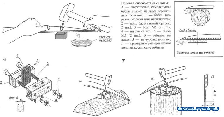 Отбивку лезвия косы производят от пятки к носку, держа полотно сначала за пятку, а потом за обушок (утолщённый тыльный край).