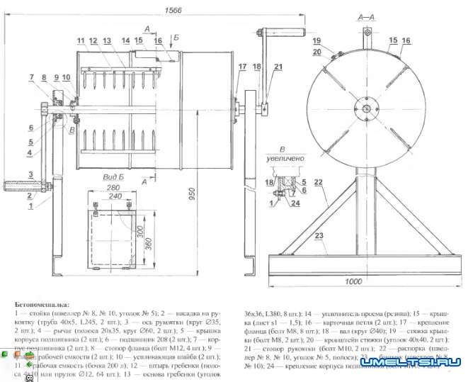 Бетономешалка сделана из обычной 200-литровой бочки, горизонтально насаженной на рабочий вал, установленный на двух опорах в подшипниках качения; загрузка-выгрузка — через прямоугольный проем в обечайке. Описано немало вариантов бетономешалок на базе стандартных бочек. Каждая из них имеет свою «особинку». Здесь же «изюминкой» являются расположенные внутри барабана гребенки, обеспечивающие ускоренное перемешивание и повышение качества бетонной смеси.