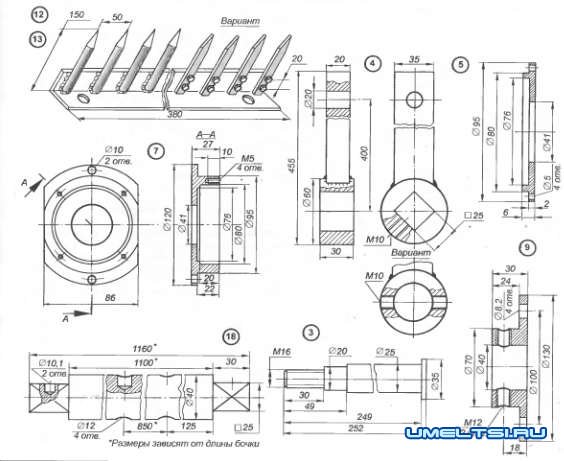 Осталось изготовить рычаги и рукоятки вращения барабана, опять-таки исходя из имеющегося материала. Эти детали изображены на рисунке. Еще один совет: чтобы не набить мозоли на руках, необходимо на оси рукояток, предварительно промазанных любой смазкой, установить с зазором вырезанные из труб втулки, обеспечив их свободное вращение. Длина втулки должна быть такой, чтобы можно было взяться за нее двумя руками.