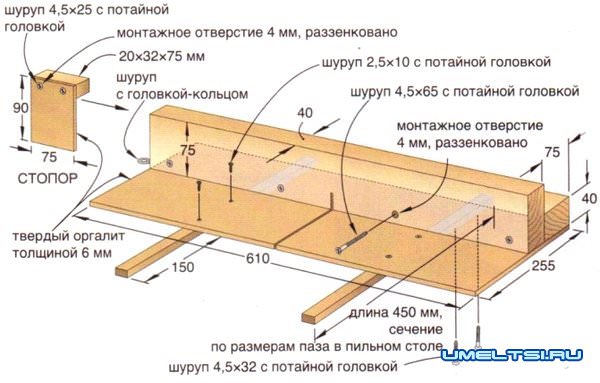 Сначала выпилите основание салазок из твердого оргалита толщиной 6 мм. Затем опилите под прямым углом обе кромки бруска толщиной 40 мм до окончательной ширины 75 мм и выпилите из него два отрезка длиной 610 мм. С помощью клея и шурупов скрепите обрезки вместе, сформировав упор Г-образного сечения. Затем приклейте упор к основанию.