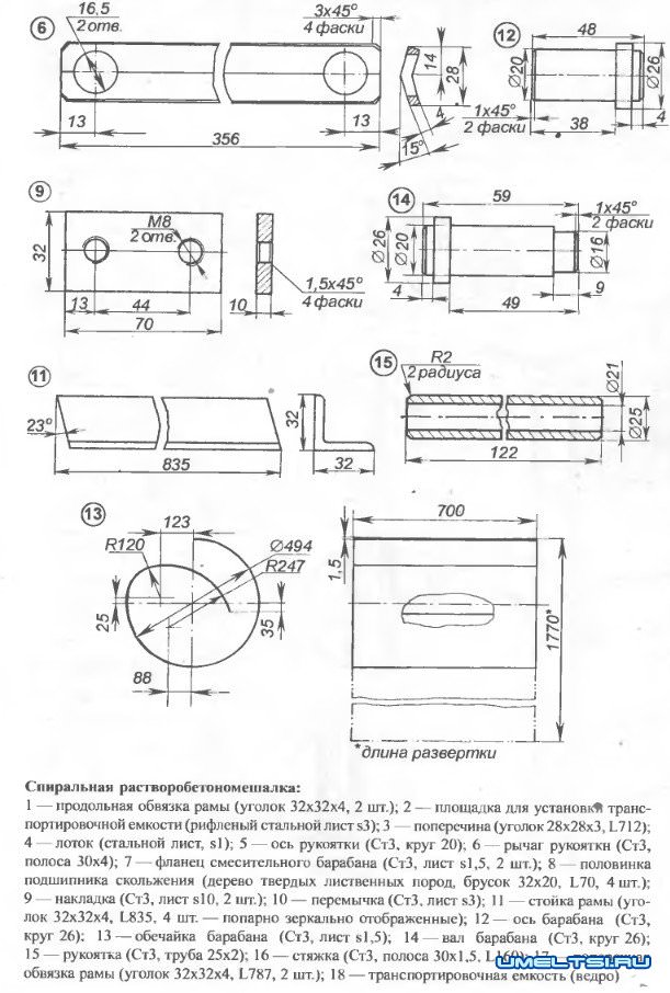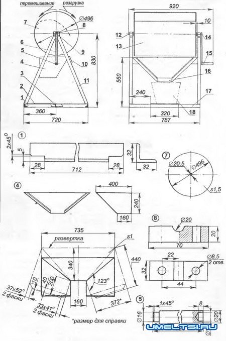 Следует отметить, что чертежи установки разработаны для ее изготовления в оборудованной мастерской, где есть возможность резки, гибки и сварки металла, а также выполнения токарных и сверлильных работ. Однако это не должно останавливать само-дельщиков — ведь прототип этой бетономешалки я изготовил буквально на «коленке» — из того материала, что был под руками.