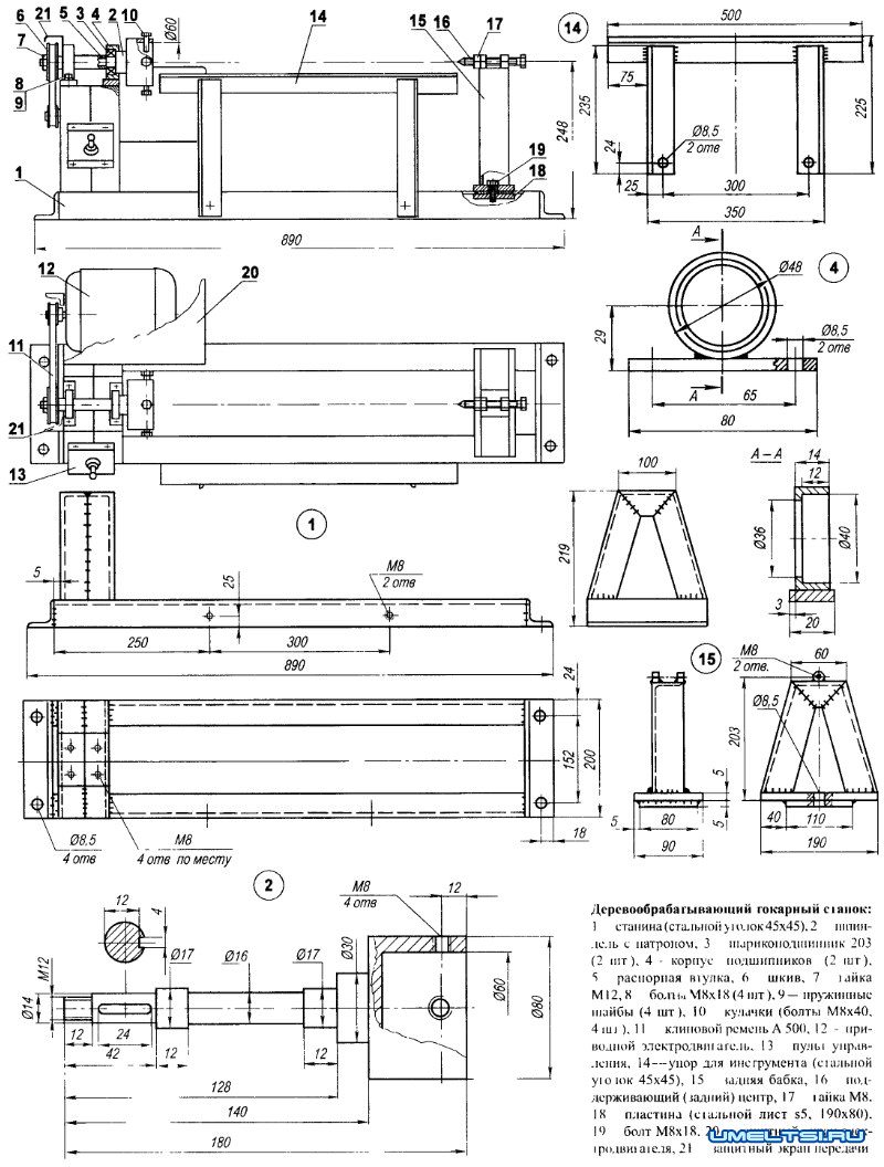 При желании изготовить станок в домашних условиях прежде всего приходится решать, каким будет привод. Для малого деревообрабатывающего токарного станка это может быть электродрель, двигатель от стиральной машины или другой бытовой техники мощностью 200—500 Вт при 1400—2200 оборотах в минуту, желательно с готовой клиноремен-ной передачей В созданном станке использован привод от стиральной машины СМР-1,5