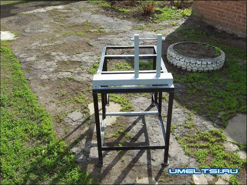 Материалом для рамы отлично послужит уголок 25*25 мм, нарезаем болгаркой заготовки и свариваем. К верхней плоскости рамы на расстоянии 70 мм от края привариваем швеллер №10, к которому, в свою очередь, с помощью болтов крепятся две вертикальные стойки из квадрата 40*40 мм.