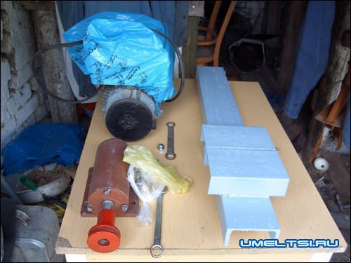 Теперь об электродвигателе для отрезного станка. Предпочтение следует отдать асинхронным двигателям, как более надежным и долговечным. Практика показывает, что для нормальной работы с отрезным диском Ø 400 мм идеально подходит « трёх тысячник» мощностью 2,2 кВт, питаемый от трёхфазной сети. Сгодится и полутора тысячник, но передаточное число ременной передачи необходимо выбрать так, чтобы на валу было около 6000об/мин. В случае питания от однофазной сети, мощность двигателя следует увеличить на 30% и применить рабочий и пусковой конденсаторы.