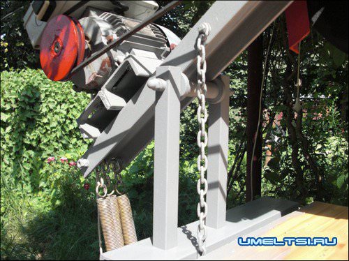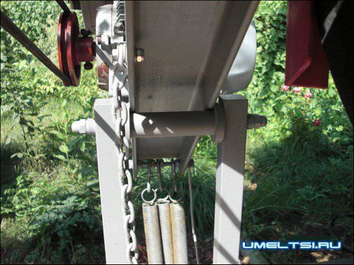 Ход коромысла ограничивается цепью, а со стороны двигателя для облегчения возврата устанавливаются пружины (например, от спортивного эспандера). Крепления цепей и пружин – с помощью болтов.
