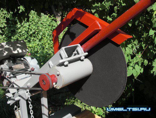 Рабочий вал с опорами, фланцами под диск и шкивом под ремень типа «А» заказываем токарю, причём выступ фланца должен быть Ø32 мм. В этом случае на станок можно будет устанавливать как отрезной диск, так и пильной диск по дереву. И двигатель, и вал крепятся к валу с помощью болтов и гаек М10.
