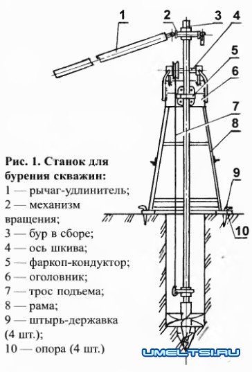 Станок прост, сделать его, имея навыки в конструировании, несложно. Да и материалов потребуется немного: несколько метров уголка 25x25 на раму, немного листового железа на оголовник и опоры, с десяток метров трубы диаметром 42 мм на сам бур, удлинители к нему и рычаги вращения. Из готовых узлов и деталей понадобятся фаркоп от автомобиля (у меня — от ГАЗ-52), ручная лебедка, рассчитанная на усилие не менее 500 кГс (для подъема бура), четыре штыря-державки (можно использовать зубья от бороны) и шнеки разного диаметра для изготовления буровых насадок.