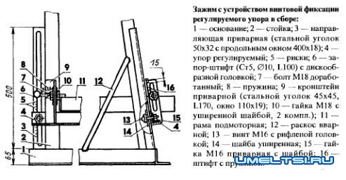 Подмоторная рама крепится в станине шарнирно. Для натяжения ремней служит регулируемый упор из уголка 50x50 мм, который фиксируется на нужной отметке двумя замками. Сам уголок зажимается двумя болтами М16 с рифленой головкой.