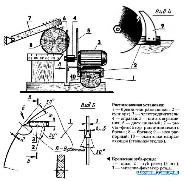 Особое внимание — технике безопасности. Из листа фанеры несколько больших размеров, чем диск, изготавливается предохранительный щиток. Сзади диска к суппорту крепится распорный нож (вид А). Сам диск устанавливается на оси плотно, но не намертво — необходимо оставить ему возможность провернуться при случайной ударной нагрузке. Суппорт подается вперед толкателем из сухой палки, плавно и без рывков. Работать следует в очках, а к месту работы — не подпускать посторонних.