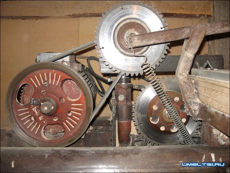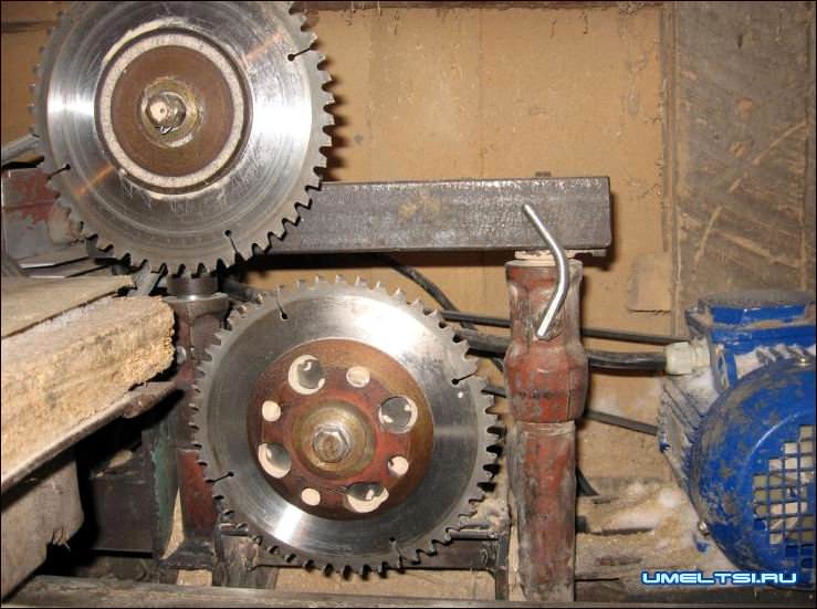 Для изготовления такого станка своими руками вам потребуется два электрических двигателя с одинаковыми 250-ти мм диаметрами дисков и с одинаковым количеством оборотов, равным 6000. Один из двигателей основной и он должен обладать мощностью в 3,5 кВт. Второму же достаточно 800 Вт. Это подрезной диск. Управление станком проходит через верхний основной диск. На рычаг, установленный для прижима, следует установить резиновую прокладку. Она предотвратит возможность поцарапать ДСП. Основа станка представляет собой две трубы, причем желательно цельнотянутые, по ним на роликах движется стол с заготовкой. Также необходимо станок оснастить вытяжкой.