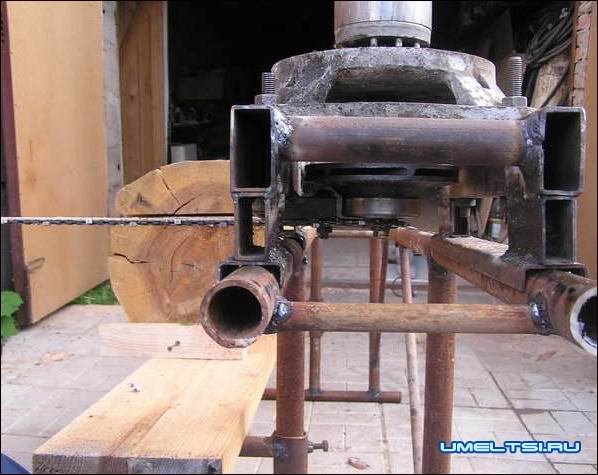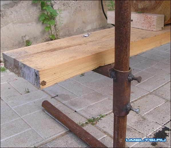 - на стойку нужно приварить подпятник, на который и будет опираться полено. Бревно и вся опора поднимается вручную, а механизм фиксируется при помощи болтов (как показано на фото).