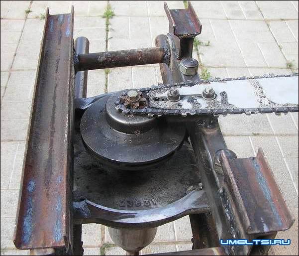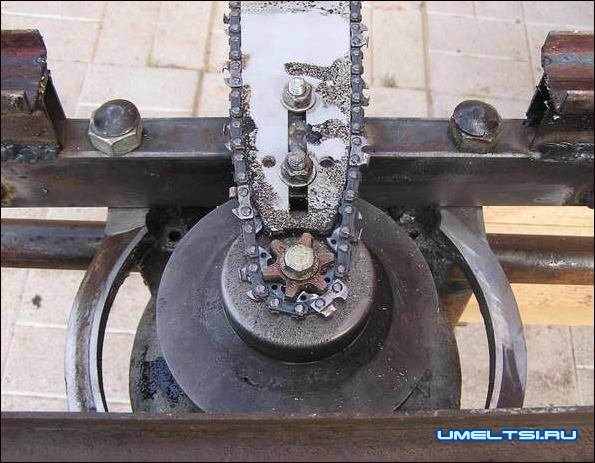- также необходимо приобрести шину длиной 40 см с цепью для продольного распила. Угол заточки составляет 10 градусов. Шина будет крепиться к каретке при помощи двух болтов в штатный паз. Натяжка цепа проводиться руками, при этом одновременно затягиваются болты, что крепят шину. Вал двигателя должен вращаться не меньше, чем 3000 оборотов в минуту, шина выдерживат такую нагрузку. Число зубьев ведущей звездочки колеблется от 6 до 9, при диаметре от 4 до 6 сантиметров;