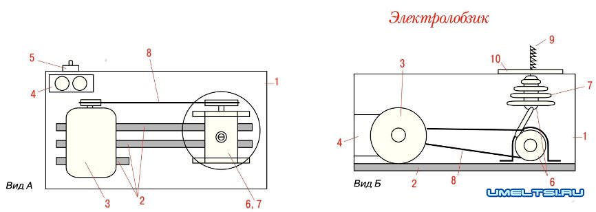 Сбил прямоугольный фанерный ящик (см. рис. п. 1) — основание лобзика. На дно прибил деревянные бруски (2) — для крепления двигательной группы. На них поместил электродвигатель от стиральной машины (3), присоединил к нему блок пусковых конденсаторов (4) и подключил кнопку пуска (5).