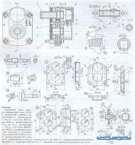 Корпус редуктора состоит из двух частей Обе части изготовлены из алюминиевого сплава АЛ-9. Наиболее ответственные размеры в обеих частях корпуса, которые необходимо выдержать. — это посадочные гнезда под подшипники, межцентровые расстояния между ними и соосность. Поэтому лучше и эти детали, а заодно и зубчатые колеса заказать специалистам.
