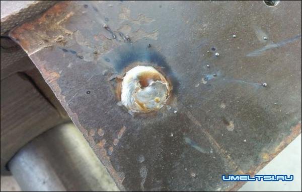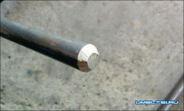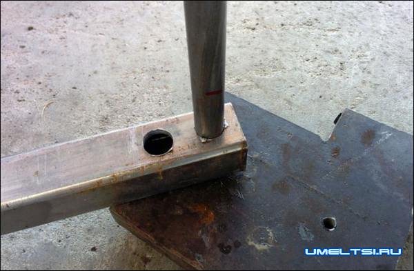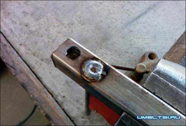 Берем прутик диаметром 12 мм и на его конце делаем фаску. После этого вставляем прут в пластину и привариваем. Следом за этим на прут надеваем изготовленный рычаг и обрезаем его, при этом нужно оставить край порядка 25 мм.