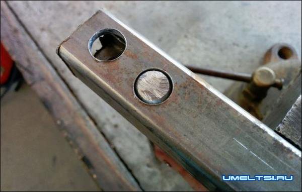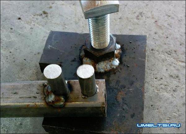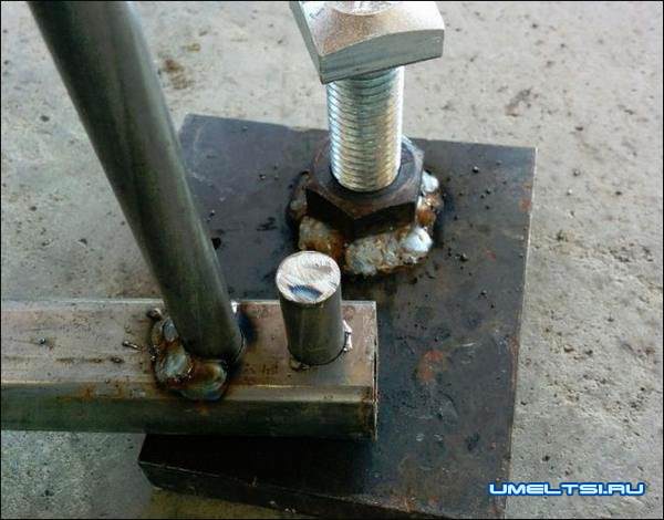 На конце прутика диаметром 12 мм делаем фаску, после чего вставляем прут во второе отверстие рычага заподлицо. Привариваем пруток к рычагу. Когда рычаг будет установлен на основание, пруток обрезаем вровень с прутком-осью. Не забываем сделать зачистку всех острых кромок станка и ввернуть в гайку болт диаметром 20 мм.