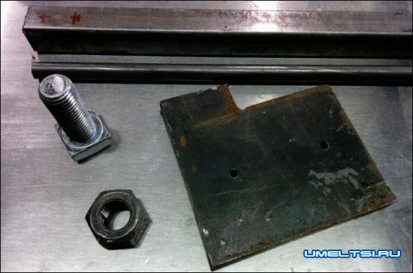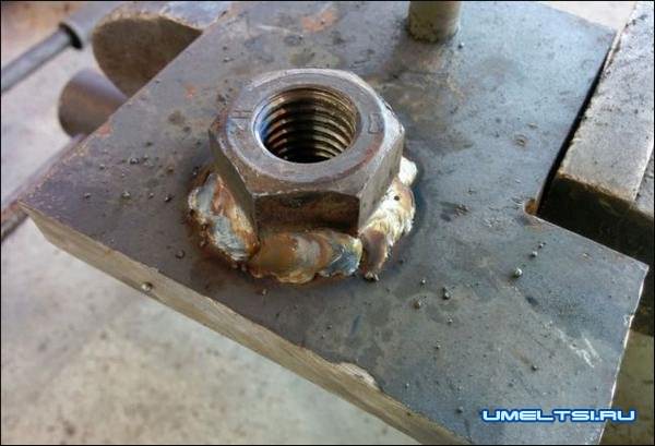 Гайка монтируется по центру пластины. Ориентируемся на сторону длиной 75 мм и отступаем 25 мм. После этого гайку привариваем к пластине.