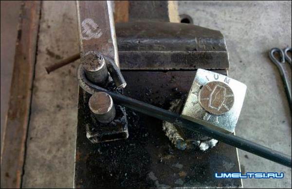 После этого станок будет готов к применению. Для начала пользования станком понадобятся тиски. Пруток нужно вставить в станок и зафиксировать с помощью болта с шайбами. Для изгибания прутка используется рычаг.