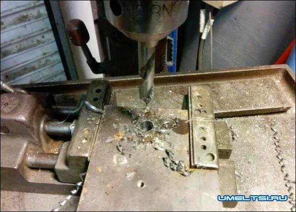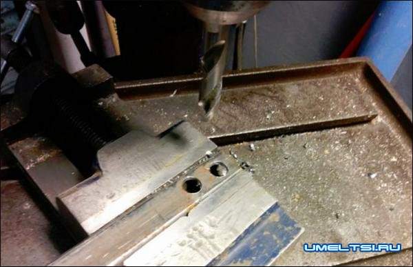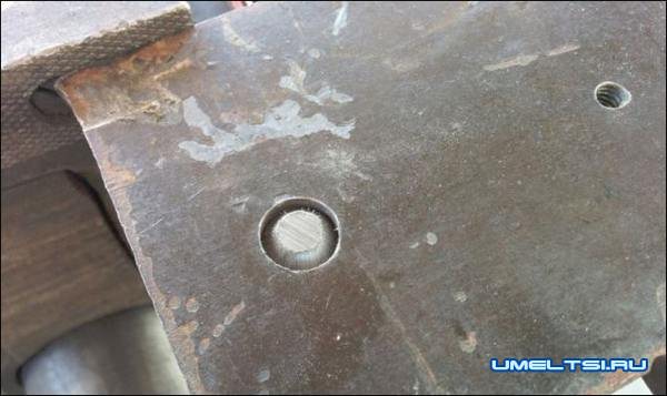 Берем направляющее сверло и в центре пластины делаем отверстие. Со стороны длиной 75 мм делаем отступ 25 мм и в этой точке сверлим. Досверливаем отверстие сверлом 12 мм.