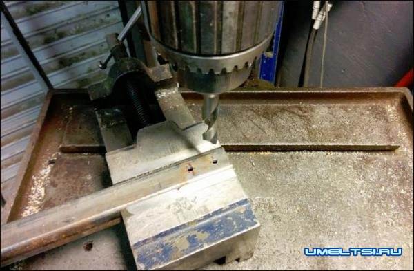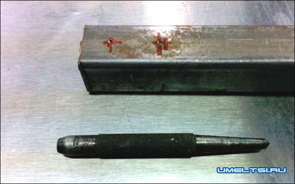 Берем металлический профиль, отрезаем кусок длиной 600 мм. На одной стороне отмечаем точки для отверстий. Одну точку нужно расположить на расстоянии 12 мм, другую – 35 мм. После эти точки нужно накернить. Затем проделываем отверстия направляющим сверлом, окончательно сверлим отверстия сверлом 12 мм.
