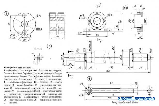 Барабан (основной рабочий орган) и его шкив — литые. В качестве материала использован алюминиевый сплав АЛ-25, из которого сделаны поршни автомобильных двигателей. Поршни расплавляются в муфельной печке, а затем отливаются в песчаную форму. Отверстия в барабане под поворотный болт-зажим шкурки и противовесный болт должны быть просверлены симметрично относительно его оси. Кстати, масса у первого (вместе с «собачкой» фиксатором) и масса второго должны быть равные. В противном случае в результате дисбаланса возникнет вибрация, которая приведёт к преждевременному износу подшипников и отразится на работоспособности станка.