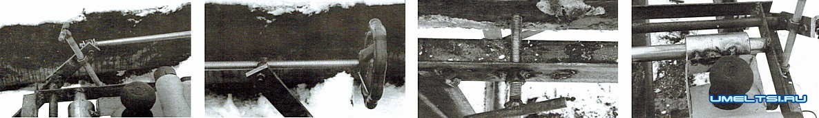 Итак, конструкция почти готова, но необходим еще один важный элемент, фиксирующий рычаги относительно рамки, иначе при движении тележки она может «сложиться», как параллелограмм. Таким элементом служит упорный винт, также изготовленный из шпильки М12 и установленный враспор между передним длинным рычагом и рамкой. Чтобы он работал именно враспор, одна гайка (нижняя), приваренная к рамке, имеет левую резьбу. Вторая гайка приварена к верхней части рычага. Затягивая этот винт, мы жестко связываем рамку и передние рычаги. Вращая же его, имеем возможность регулировать высоту рамки в пределах ±25 мм.