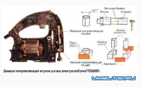 Ничто не вечно, и со временем износ направляющих втулок,появился заметный люфт штока, после чего выполнять точные работы этим лобзиком стает трудно.Так как расставаться с удачной моделью не хочеться, я решил его можна восстановить. Для этого нужно заменить верхнюю и нижнюю направляющие втулки штока.
