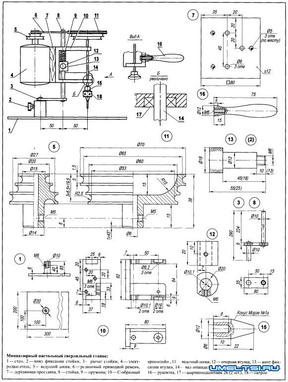 На стойку надет кронштейн с электродвигателем, шкивами и шпинделем. Этот узел может скользить по вертикальной стойке и возвращаться в исходное положение пружиной, опирающейся на бронзовую втулку с винтом фиксации Мб.