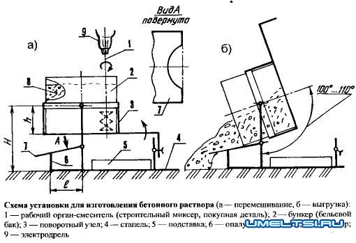 Хочу предложить свой, более простой вариант. Когда мне понадобилось большое количество строительного бетона, я, проанализировав все изложенное, стал искать оптимальный вариант его приготовления, отвечающий следующим условиям: максимально возможное облегчение работ (по сравнению с «лопатным» способом) путем механизации, простота конструкции и малые материальные затраты при изготовлении.