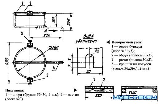Основной элемент поворотного узла — обруч, к которому приварены две полуоси (болты М8 головками наружу). Обруч согнут из полосы (но можно использовать готовый из уголка, например, соединительный фланец круглого воздуховода вентиляционной системы). Снизу к обручу приварена (или приклепана) П-образная рамка, которая служит опорой для бункера-бака. Закрепленная на рамке рукоятка работает как рычаг при выгрузке, а ее отогнутый конец крепится к упору при перемешивании раствора.