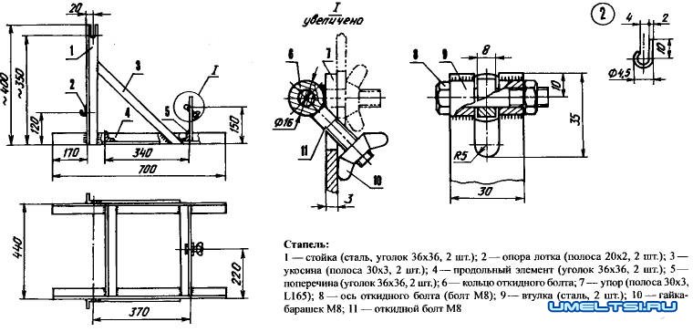 Стапель состоит из основания (два продольных стальных лонжерона, соединенных парой поперечин), к которому приварены две стойки с пазами вверху под полуоси поворотного узла. Перечисленные детали— из уголка 36x36 мм. Стойки усилены откосами из стальной полосы. К задней поперечине основания вертикально приварен упор с шарнирным болтом, служащий для фиксации поворотного узла в процессе приготовления раствора.