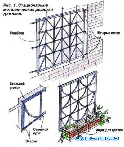 Современные защитные ограждения, как правило, изготавливают из металла (рис. 1,2). Обычно они—либо сварные, либо кованые. Такие ограждения благодаря высокой прочности вполне способны обеспечить квартире или загородному дому необходимую защиту. Чаще всего домовладельцы отдают предпочтение наиболее экономичному варианту — металлическим решёткам, сваренным из арматуры или стандартного проката квадратного или круглого профиля, полосы и уголка.