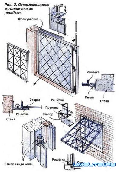 Такое усиление стен вполне способно выдержать натиск вандалов, даже если они «вооружены» ломом (рис. 3,А). Защитив дом металлическими решётками, хозяин сталкивается с другой проблемой — как обеспечить безопасность проживающих в нём людей в экстремальных условиях, в частности, в случае пожара и других чрезвычайных происшествий. Чтобы не препятствовать эвакуации людей из дома, решётки следует устанавливать в оконном проёме с помощью прочных металлических петель, приваренных к верхней или к боковой перекладине. При этом внизу или сбоку решётки надо установить замки, которые не видны с улицы, а запираются (открываются) изнутри дома (см. рис. 2). Когда возникает необходимость, такие замки можно быстро открыть — штырь легко вынимается и решётка открывается.