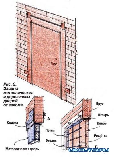 Если верить статистике, большинство случаев незаконного проникновения в дом происходит именно через окна. Но это не исключает возможности попасть в дом и через дверь, взломав или сорвав её с петель. Поэтому для обеспечения надёжной защиты входной двери её также желательно закрыть решёткой. В первую очередь в этом нуждаются деревянные двери (рис. 3).