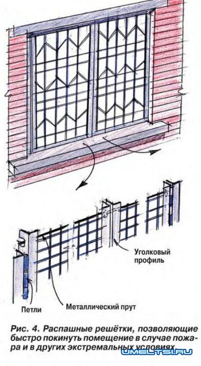 Другой вариант — сделать решётки распашными, то есть состоящими из двух половинок, каждая из которых крепится к оконному проёму при помощи мощных металлических петель. В центре они стыкуются, образуя единое защитное полотно (рис. 4). Для жёсткого соединения половинок решётки используют три металлических штыря (вверху, в центре и внизу решётки). В случае экстремальных условий штыри легко вынуть, открывая путь к выходу из дома.