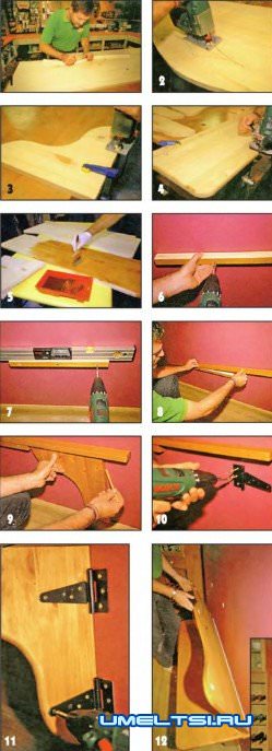 2.По разметке электролобзиком выпиливают верхнюю кромку спинки и ромбовидный проём. Чтобы выпилить последний, в щите предварительно сверлят отверстия под пилку электро-лобзика. Целесообразно сделать два отверстия вблизи тупых углов ромба. В этом случае не надо будет разворачивать пилку электролобзика в острых углах. После раскроя с кромок распилов удаляют следы режущего инструмента.