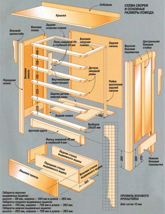 Фасадная стенка комода собрана из трёх частей: передних ножек, арочной п.арги и деталей лицевой рамы. На концах арочной царги выбирают фальцы, формируя шипы. Для деталей лицевой рамы выберите прямослойную прочную древесину, так как других дополнительных опор для выдвижных ящиков не будет.