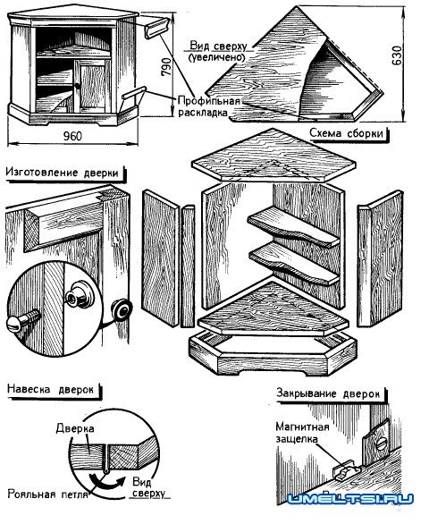 Для изготовления угловой тумбочки потребуются четыре ДСП, отделанных пластиком — для основания, внутренних полок и столешницы. Их конфигурацию и размеры домашний мастер выбирает по своему усмотрению исходя из конкретных условий: габаритов телевизора или другой техники и утвари, которая будет стоять на ней, размеров комнаты и иных соображений. При зтом надо иметь в виду, что размеры плит, отделанных пластиком, ограничены узким кругом имеющихся стандартов. Так что, возможно, придется поломать голову над оптимальным раскроем ДСП.