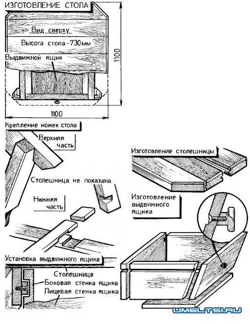 Ножки стола делают либо съемными, либо крепят к царгам «намертво» клеем и стяжными болтами. Изготовление выдвижного ящика и подножек-перекладин для стола не вызовет трудностей даже у начинающего столяра.
