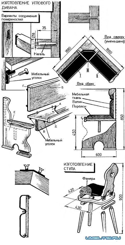 Секции I и II углового дивана — одинаковые (левый подлокотник является зеркальным отражением правого). После сборки секции объединяют угловым сиденьем II. В случае переезда угловой диван легко разобрать. Сиденье «А», спинки «Б», боковые стенки «Е» и «3» дивана соединяют между собой мебельными уголками, шкантами, шурупами-саморезами (они особенно хороши для сборки ДСП — хорошо «держат»).
