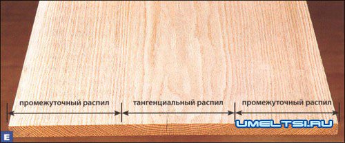 На широкой доске хорошо различаются участки с тангенциальным и промежуточным расположениями годовых колец. Для наиболее заметных деталей мебели выбирайте прямослойную древесину, а остальное используйте в других местах.