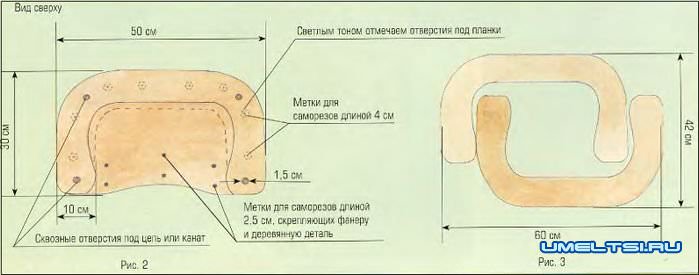 На плане (рис. 2) более светлым тоном отметим отверстия диаметром 2.5 см под планки, их мы высверлим на деревянной детали, и более темным цветом - окружности диаметром 1,5 см под цепочку или канет. Теперь на тот же трафарет нанесем тик-тиром.химию — она обозначит место нахождения верхних деталей спинки. Их мы выпилим, сверяясь с данным образцом (рис. 3).